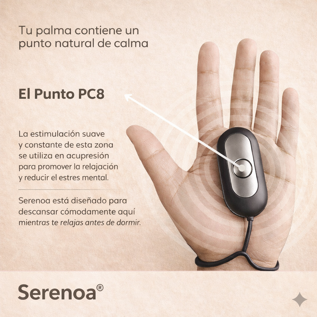 Serenoa es un dispositivo portátil que utiliza microcorrientes ultra-suaves (tecnología CES) para estimular suavemente el punto de acupresión PC8 en la palma de la mano. Esta estimulación ayuda a favorecer las ondas cerebrales de relajación (θ y α), reducir la tensión y preparar el cuerpo para un descanso más natural y reparador.